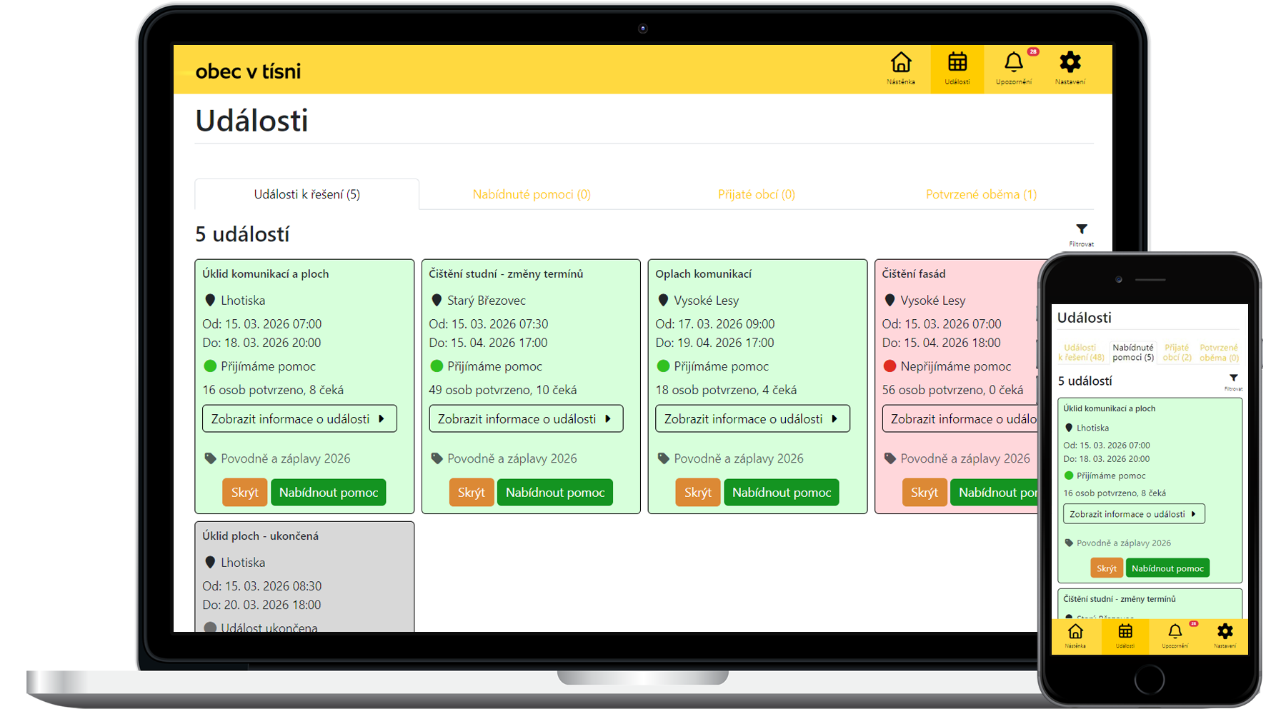Obec vytvoří událost a SDH reagují nabídkami dobrovolné pomoci vybraným obcím (počet nabídek není omezen). Obce nabídky přijmou/nepřijmou.